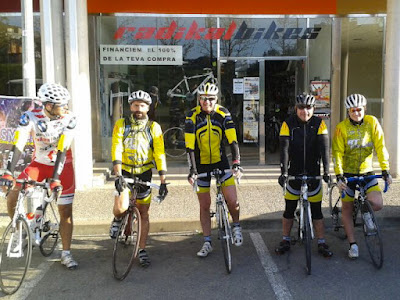 Les bicis les vam deixar carregades al vespre a la furgo d'en Pere, i la maleta feta el dia abans, així que m'aixeco, me vesteixo, esmorzo una miqueta i a esperar que vingui en Pere... anem recollint a la resta de l'equip... l'Alex ja hi és, en Dani, en Josep i en Dani Guinó que van en un altre cotxe... a Riudellots recollim a en Pitu Guinó...